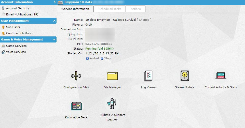 To ensure the smooth running of your Empyrion: Galactic Survival server, we have knowledgeable support staff available 24/7 to help you. Available through ticket, email, phone and Skype. We may even join you on your game server to ensure it's working as it should!
