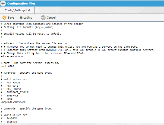 For the majority of our game servers and all our popular ones, we offer an easy to use configuration editor where you can edit the configuration of your server through simple drop downs, tick boxes and text fields. When there are also settings that can be added that are not included in the configuration editor, we also offer direct access to the file where you can edit any setting you require to the file directly.