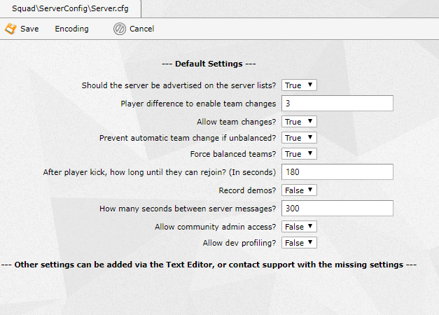 For the majority of our game servers and all our popular ones, we offer an easy to use configuration editor where you can edit the configuration of your server through simple drop downs, tick boxes and text fields. When there are also settings that can be added that are not included in the configuration editor, we also offer direct access to the file where you can edit any setting you require to the file directly.