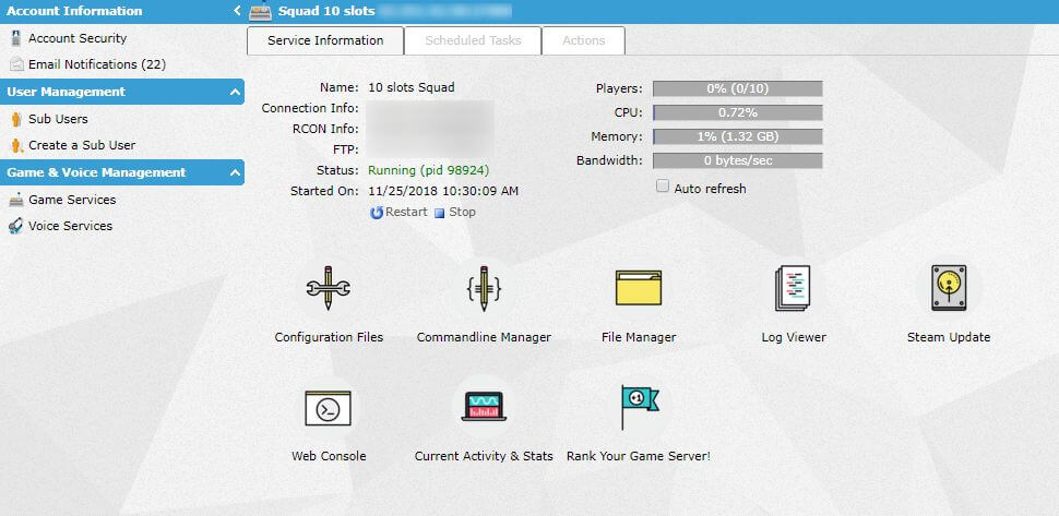 Your Squad server will be provided on Intel Xeon processors with fast ECC RAM and SSD or NVMe Storage with RAID. Ensuring the best performance and reliability of your game server.