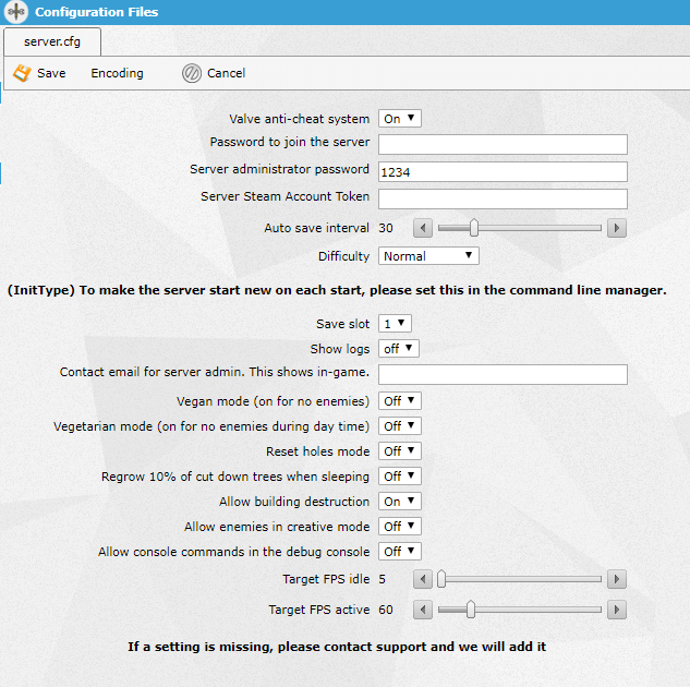 For the majority of our game servers and all our popular ones, we offer an easy to use configuration editor where you can edit the configuration of your server through simple drop downs, tick boxes and text fields. When there are also settings that can be added that are not included in the configuration editor, we also offer direct access to the file where you can edit any setting you require to the file directly.