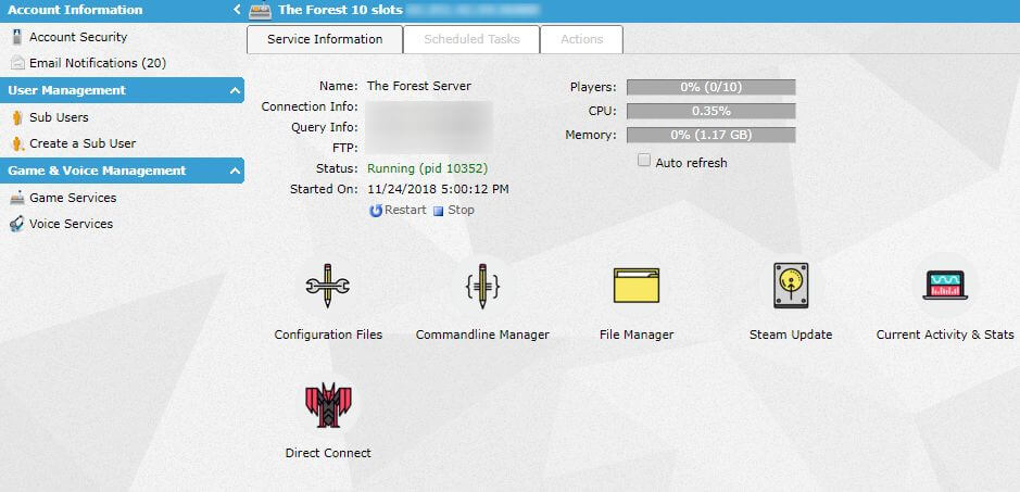 We offer DDOS protection on our The Forest server hosting to help ensure your game server stays online 24/7, 365 days a year.
